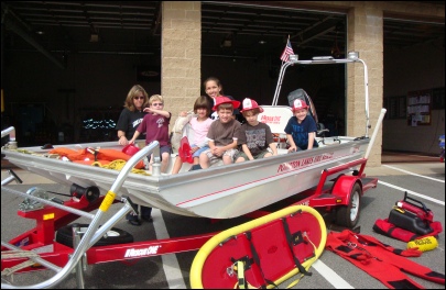 Some of the Moms and kids learning about our rescue boat
